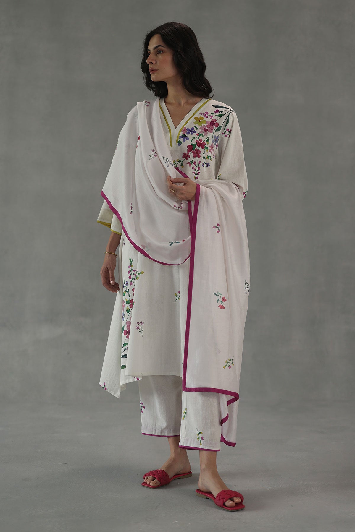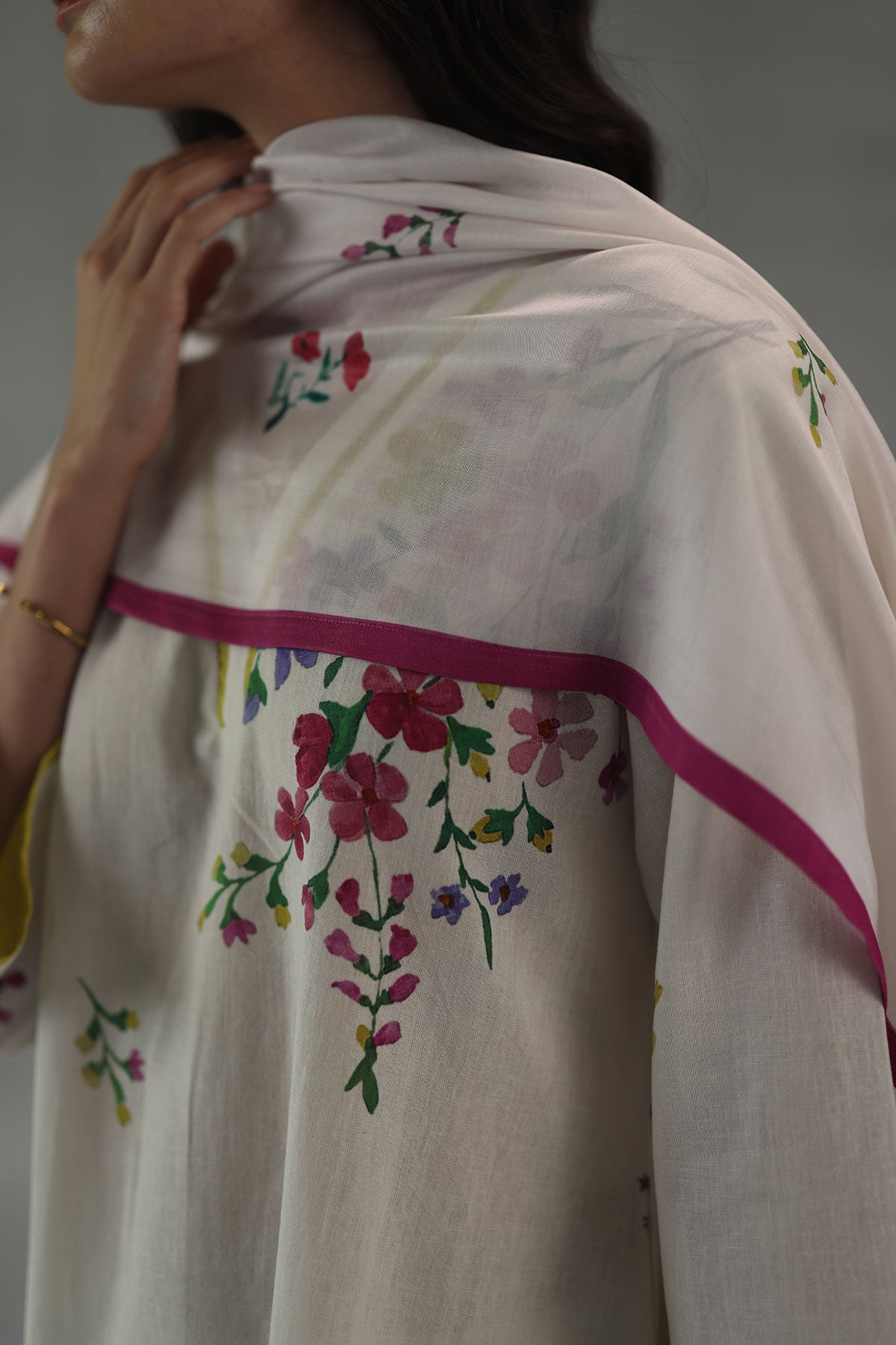 The viola stole is crafted to complement the viola kurta set with its delicate watercolor floral motifs scattered across the length. Finished with subtle fuchsia accents along the trim, this lightweight dupatta adds a soft, graceful touch to any outfit perfect for layering or styling on its own.