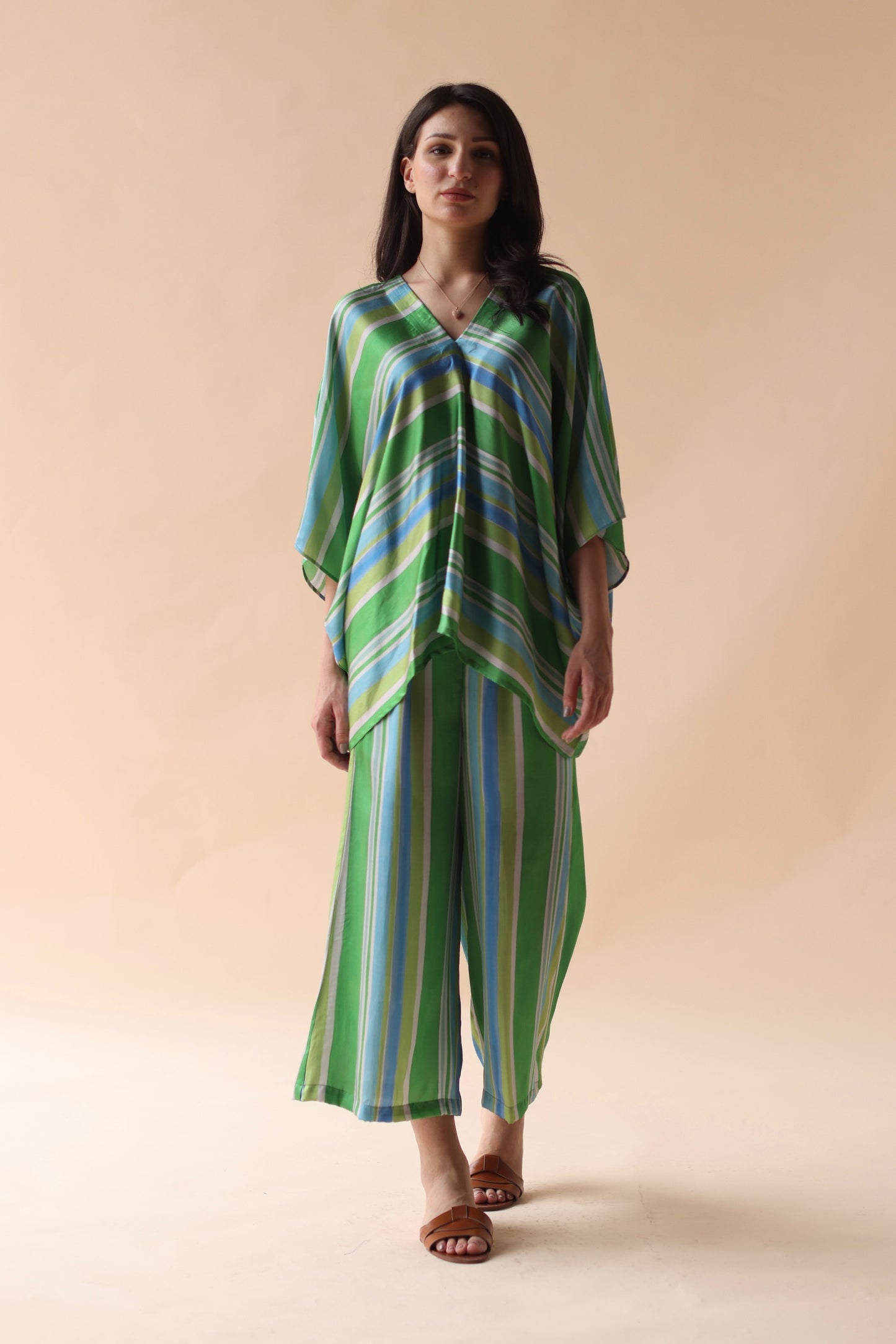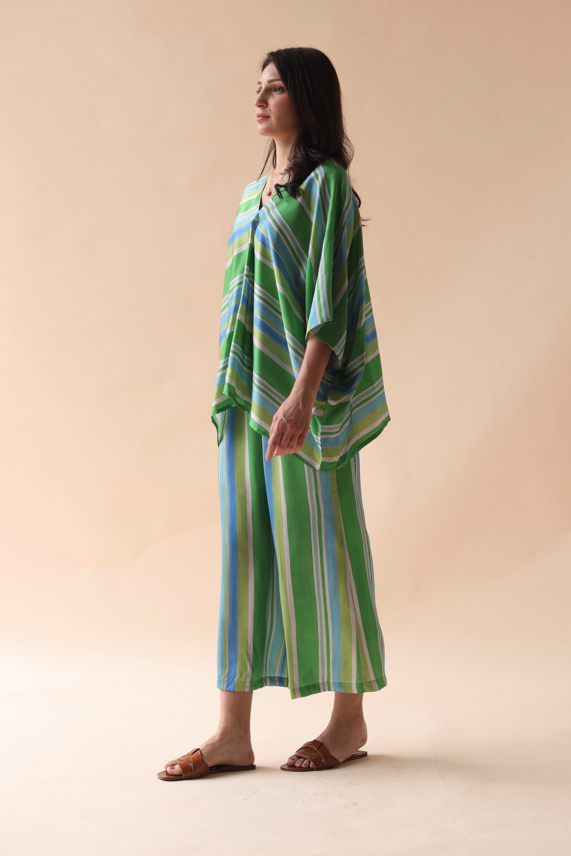 A kaftan top and pants for a flowy, breezy, and comfortable look. It features a striped pattern in our signature watercolour stripes with a v-neck and airy sleeves. The silhouette is flattering to all body types.