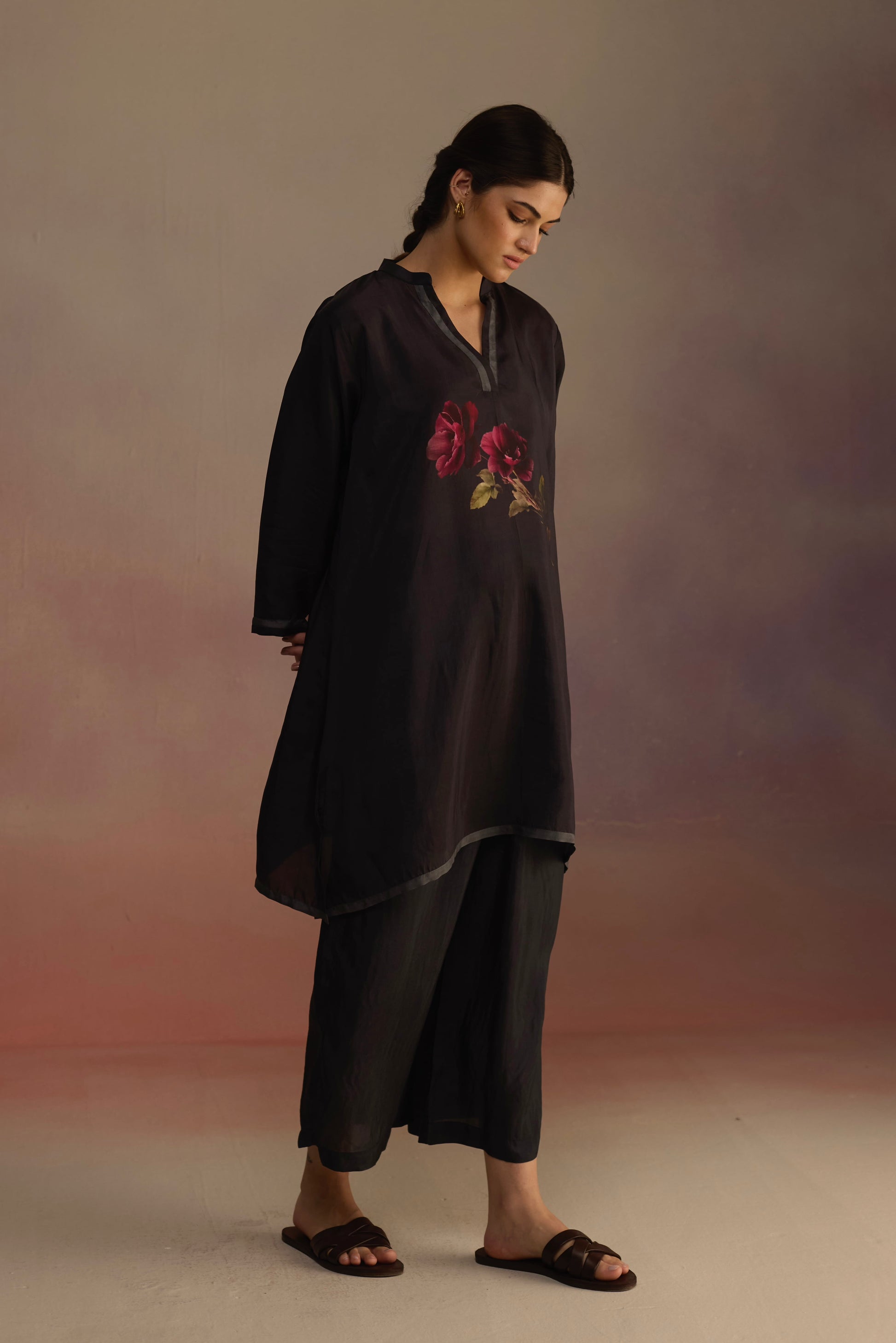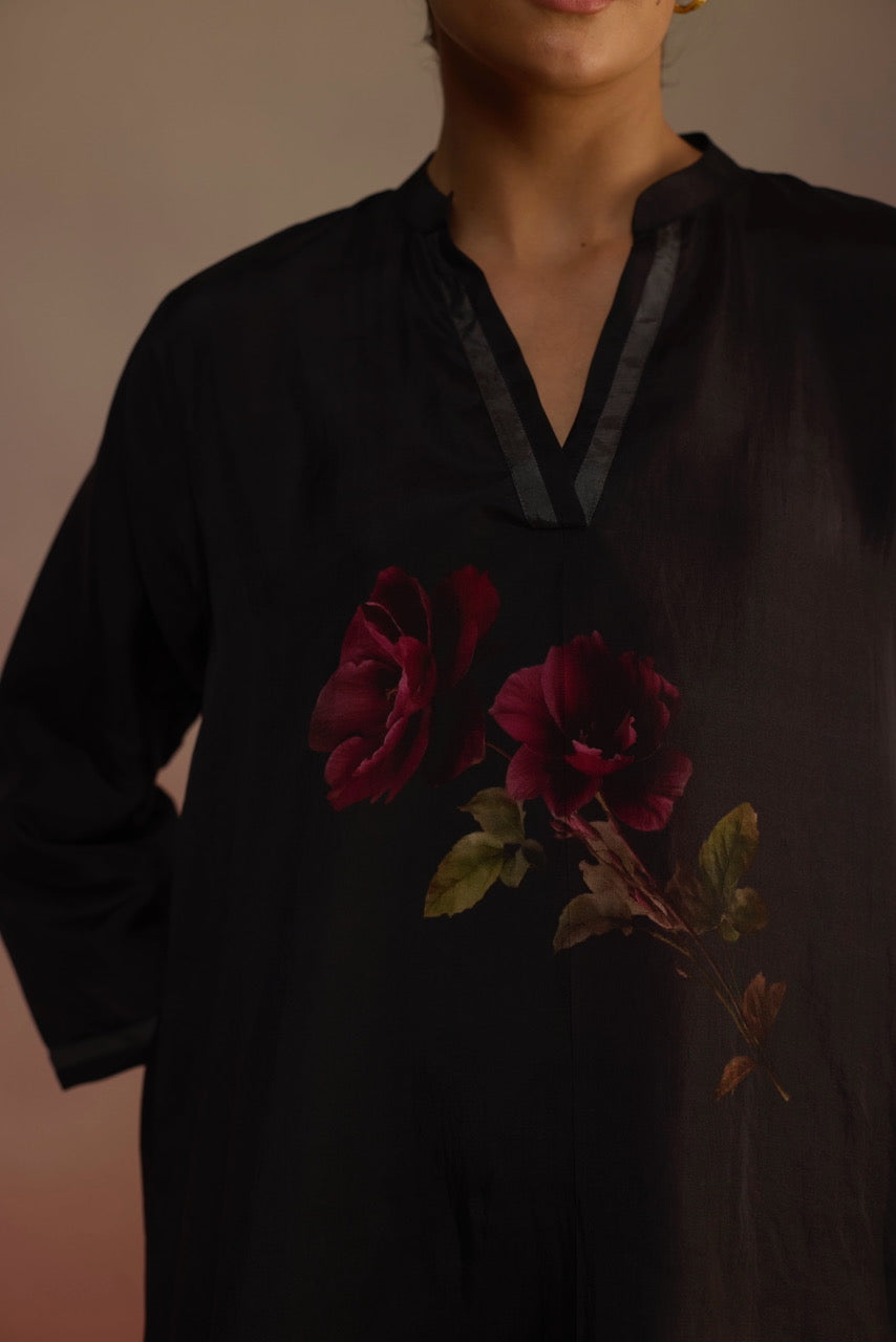 A mid-length kurta with a hand-drawn floral motif on the yoke, subtle border detailing, and a v-neck collar. Paired with wide-legged pants.