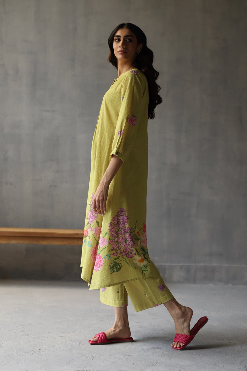 The water lily kurta is a breezy kurta in linen with watercolored bunch of flowers across the sweep. The kurta is an a-line silhouette and opens up in pleats along with the roza signature buttons to add a colourful pop. Pair with the water lily pants for that favourite outfit in your closet.