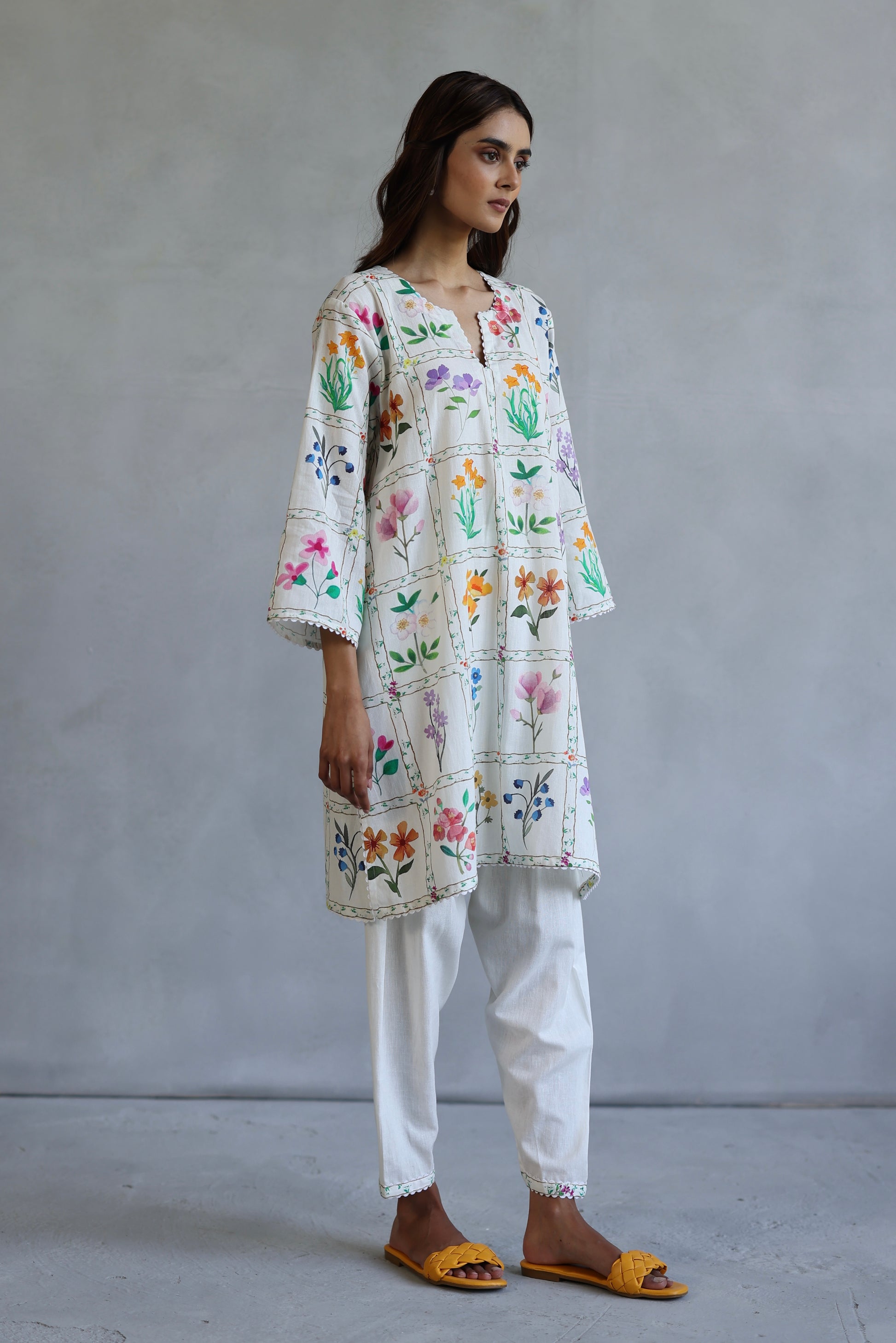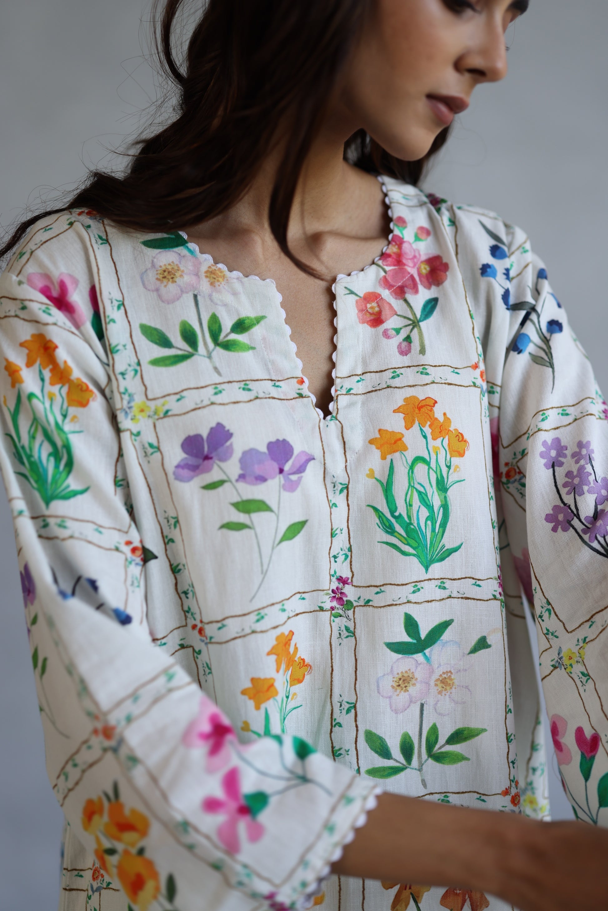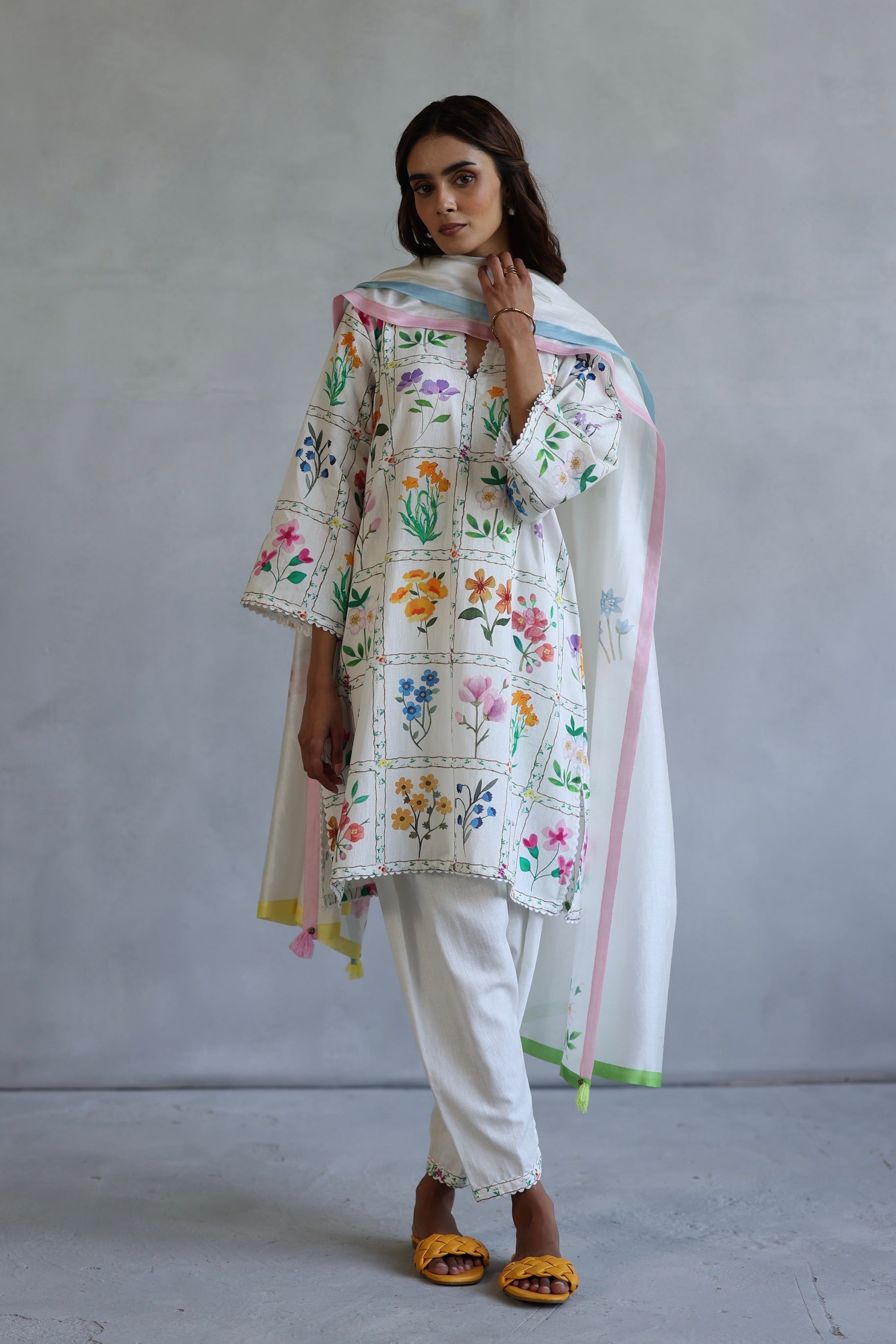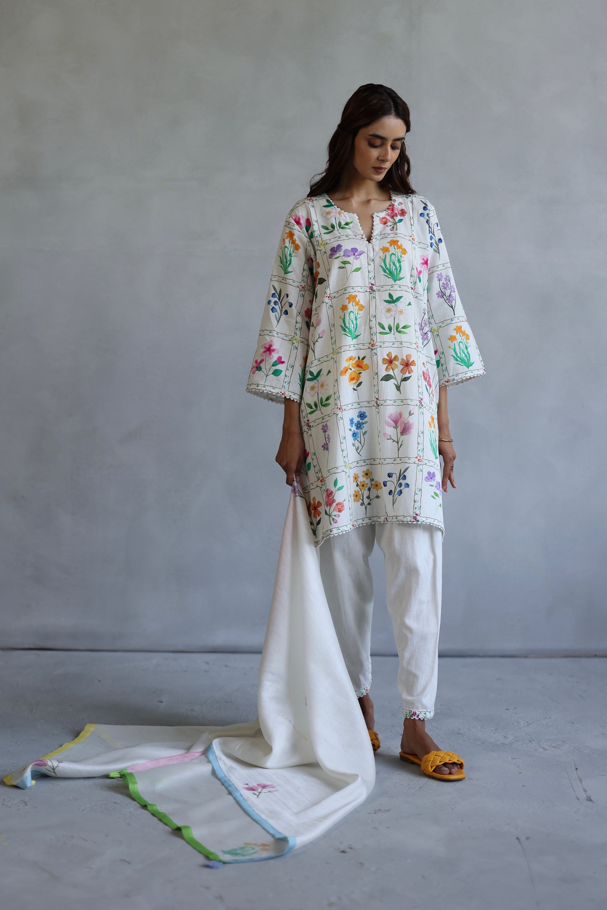 Crafted in breathable linen, this short-length kurta is adorned with intricate floral motifs inspired by patchwork and wildflower meadows. The effortless silhouette is paired with breezy straight pants for all-day comfort. Can be paired with a delicate chanderi stole, featuring subtle floral accents, a contrast border, and tassels on each corner, adding a refined finishing touch to this elegant ensemble