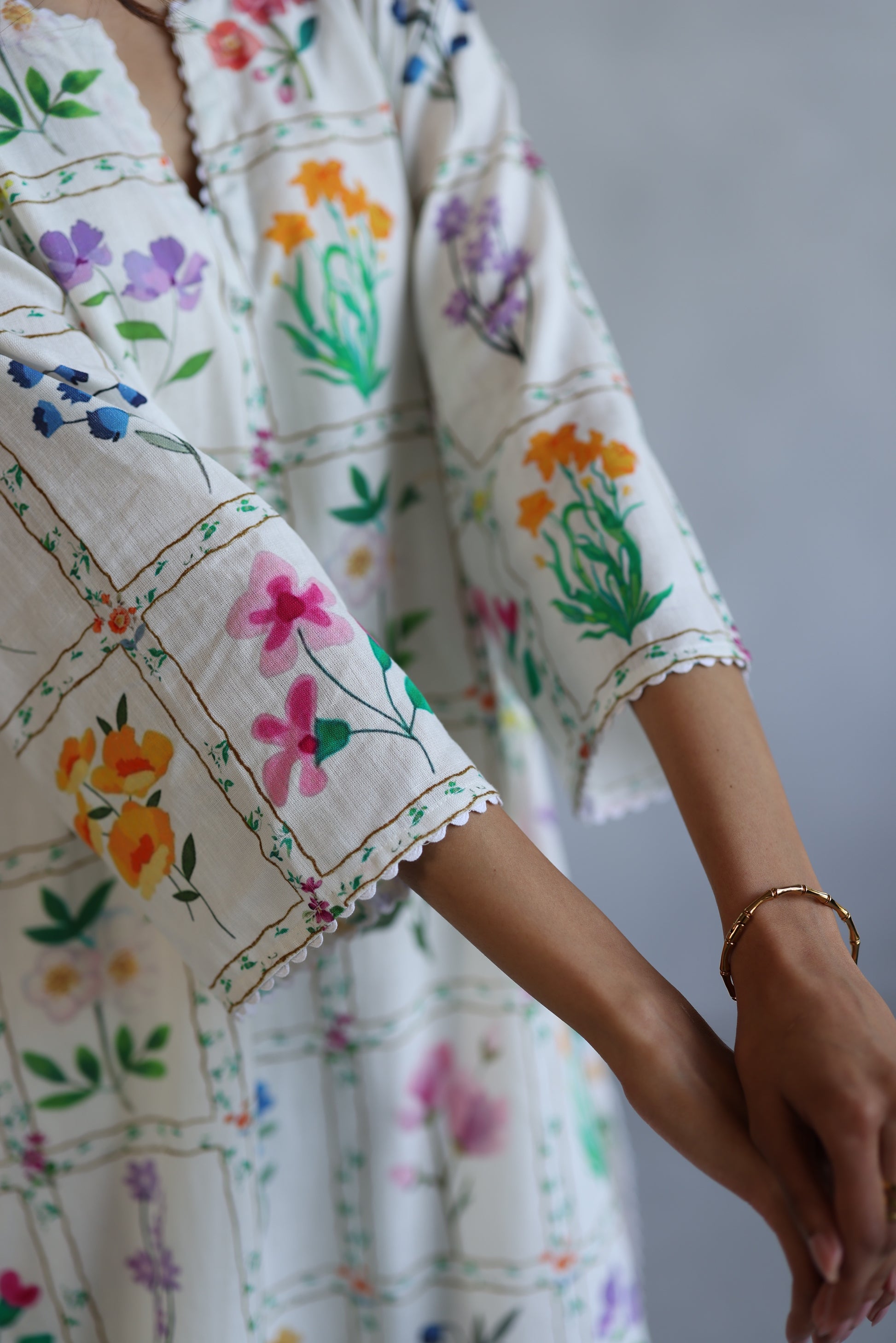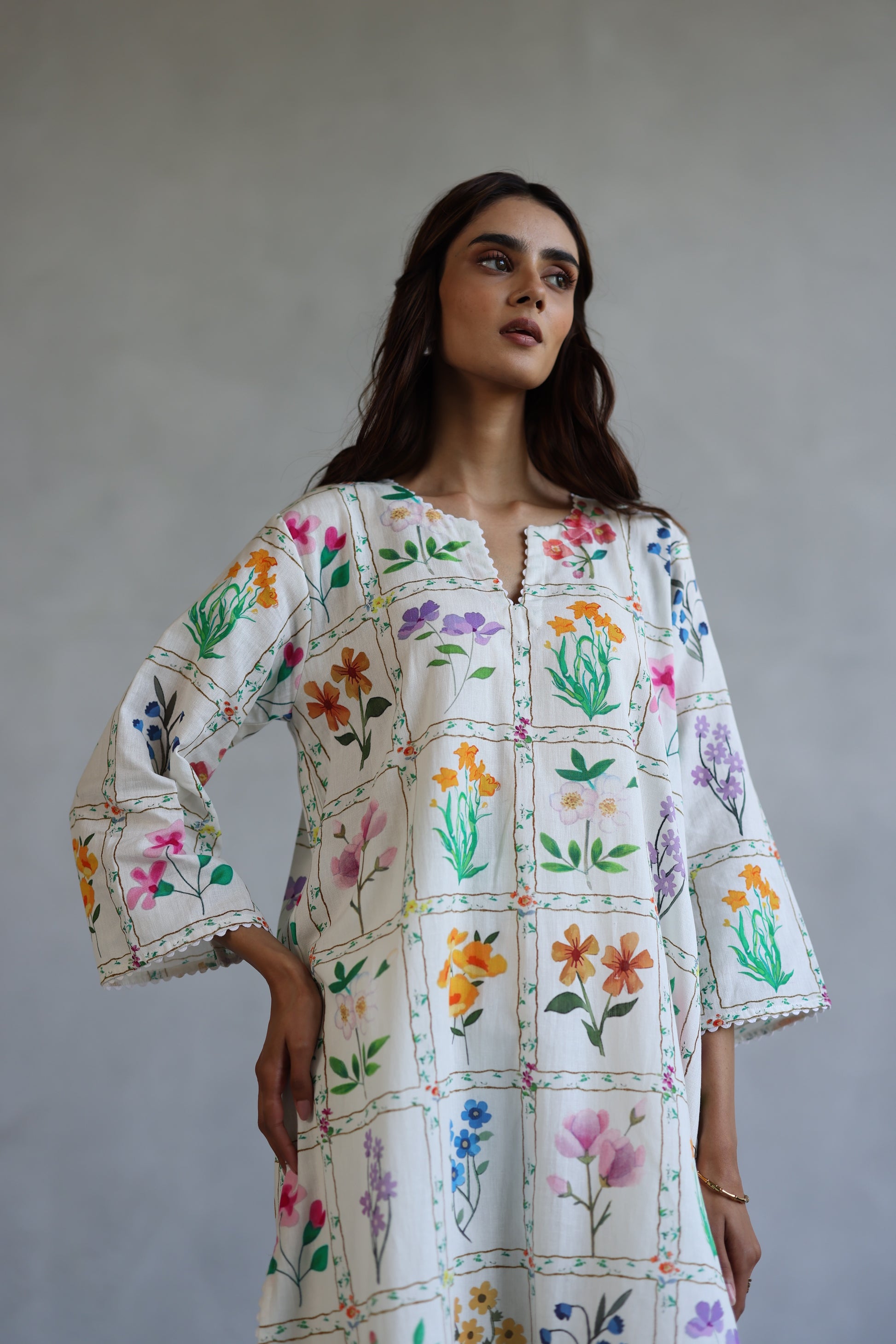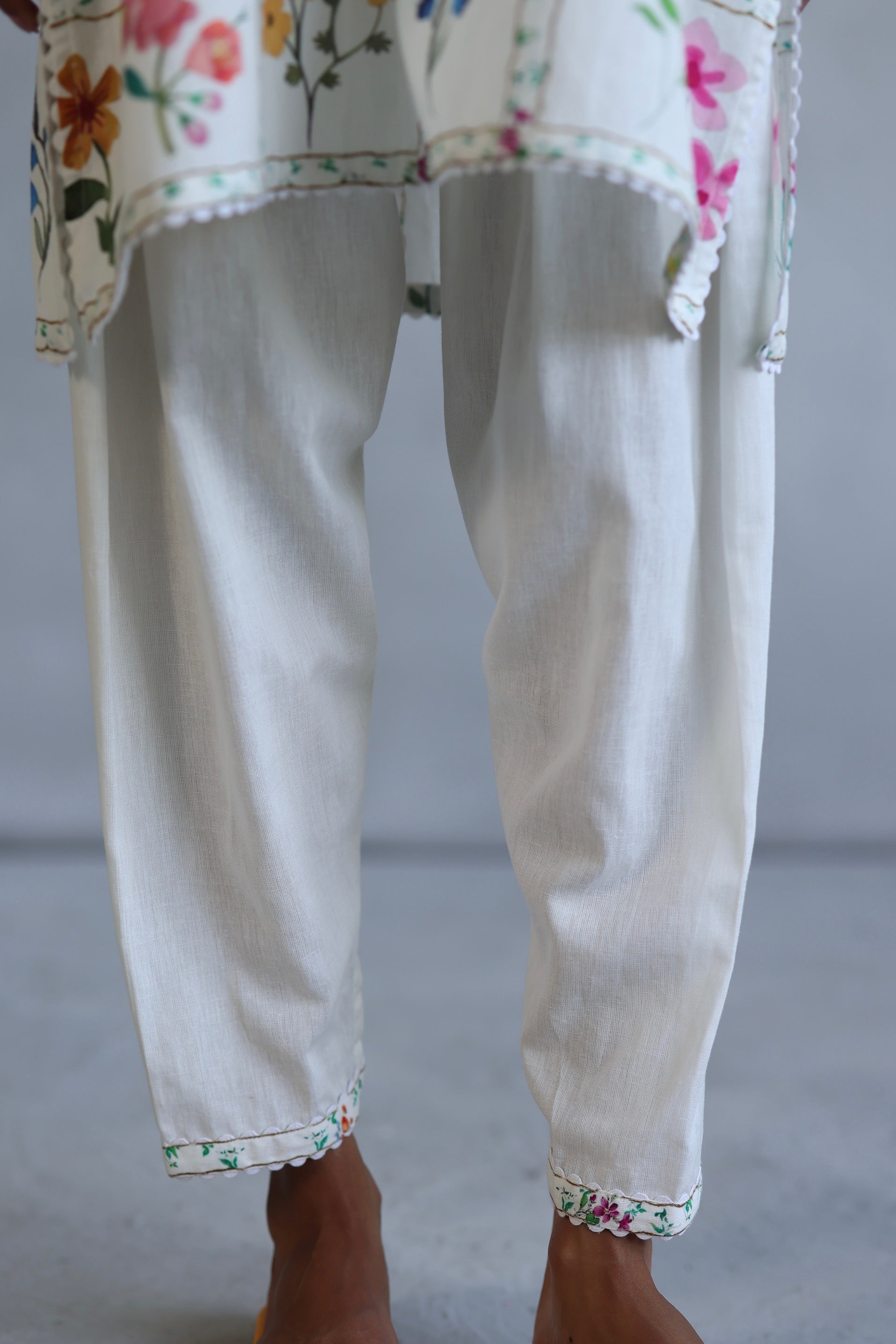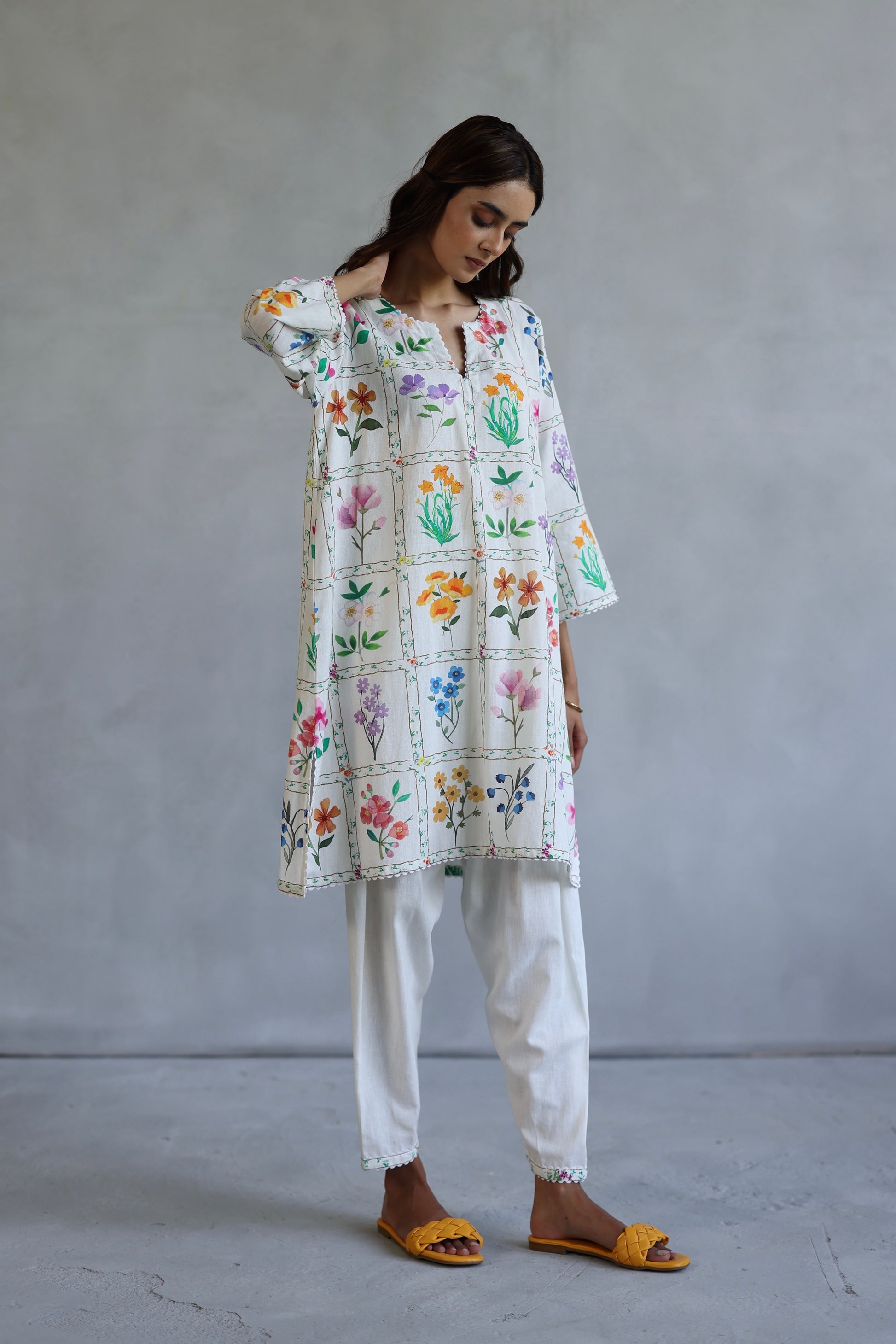 Crafted in breathable linen, this short-length kurta is adorned with intricate floral motifs inspired by patchwork and wildflower meadows. The effortless silhouette is paired with breezy straight pants for all-day comfort. Can be paired with a delicate chanderi stole, featuring subtle floral accents, a contrast border, and tassels on each corner, adding a refined finishing touch to this elegant ensemble