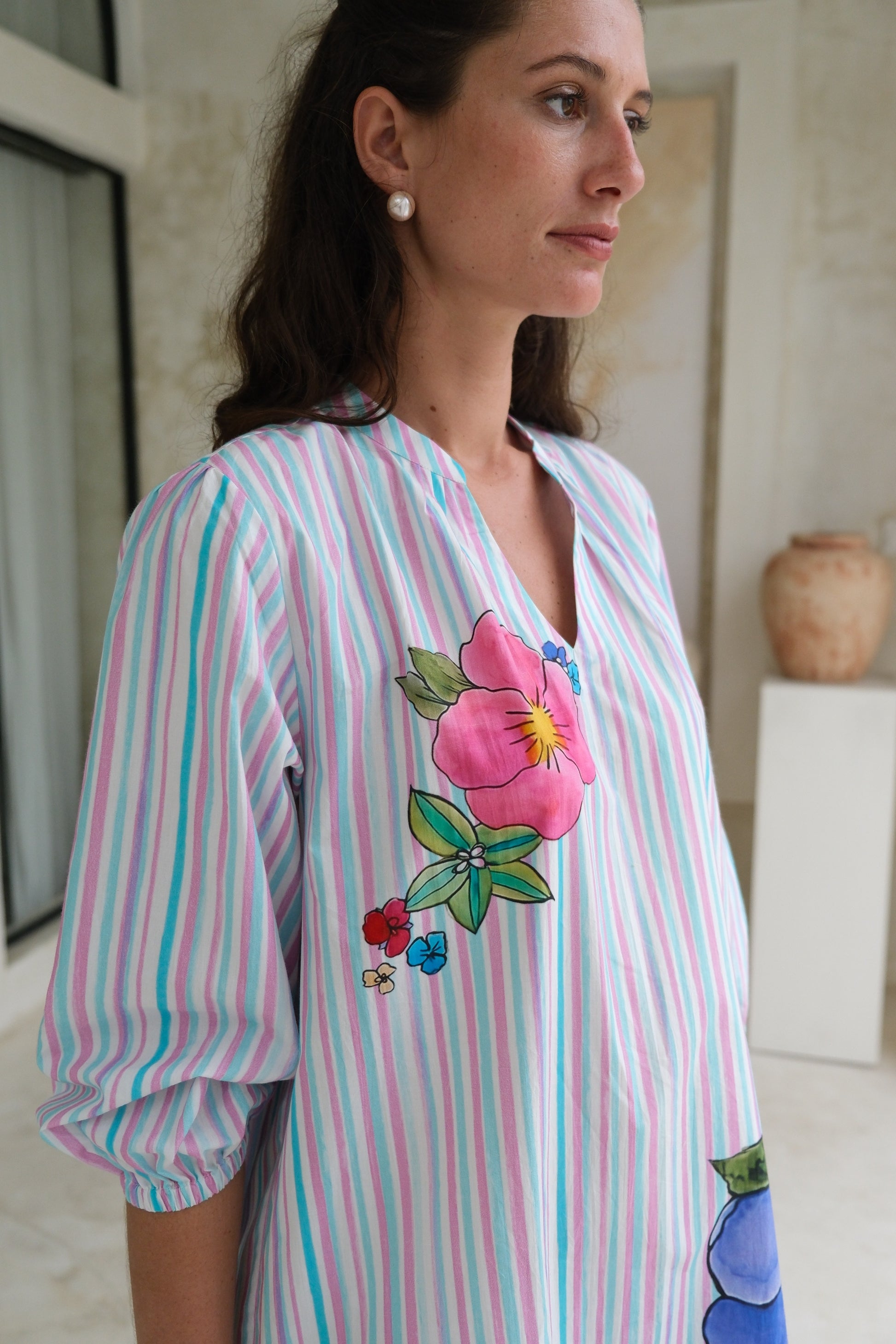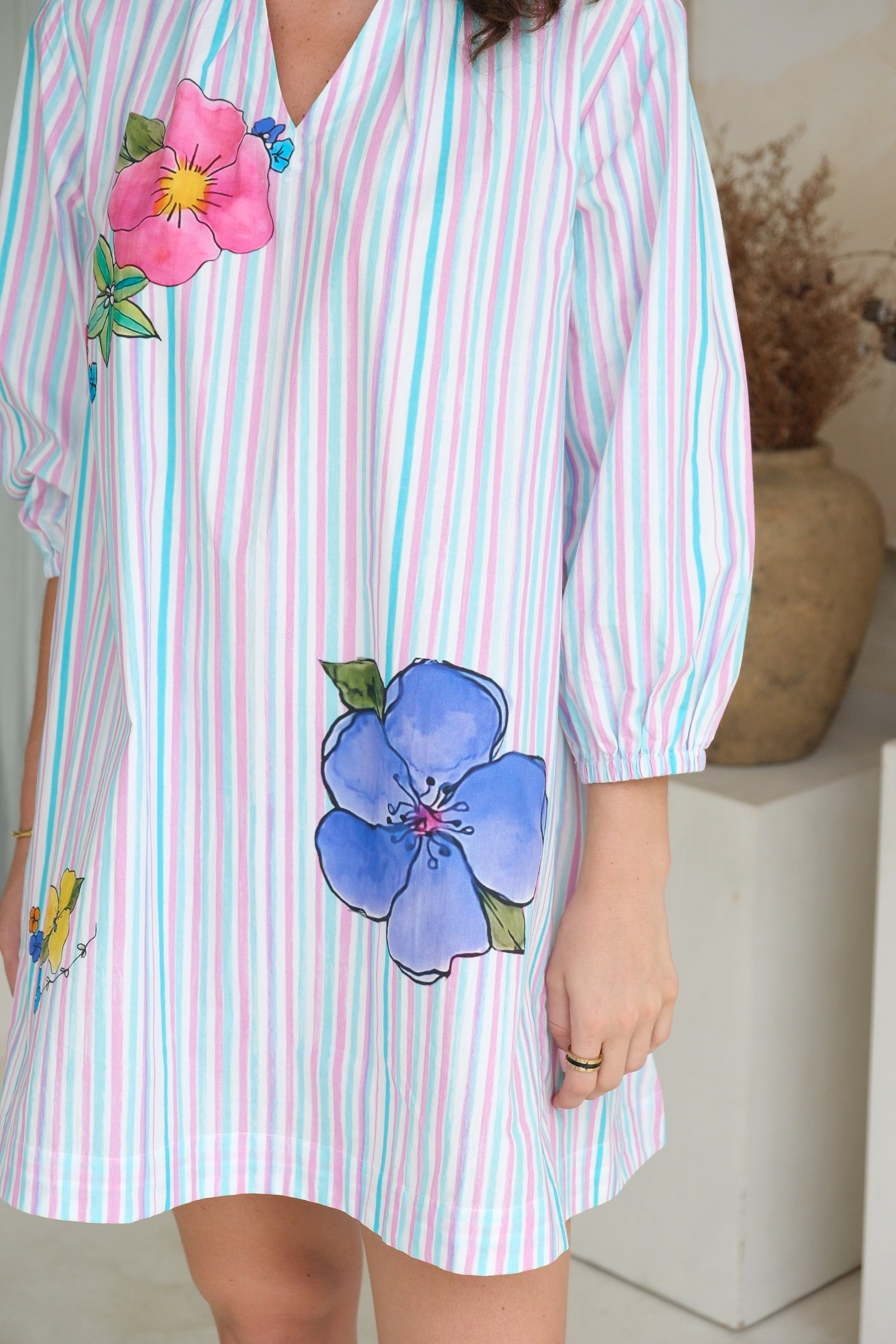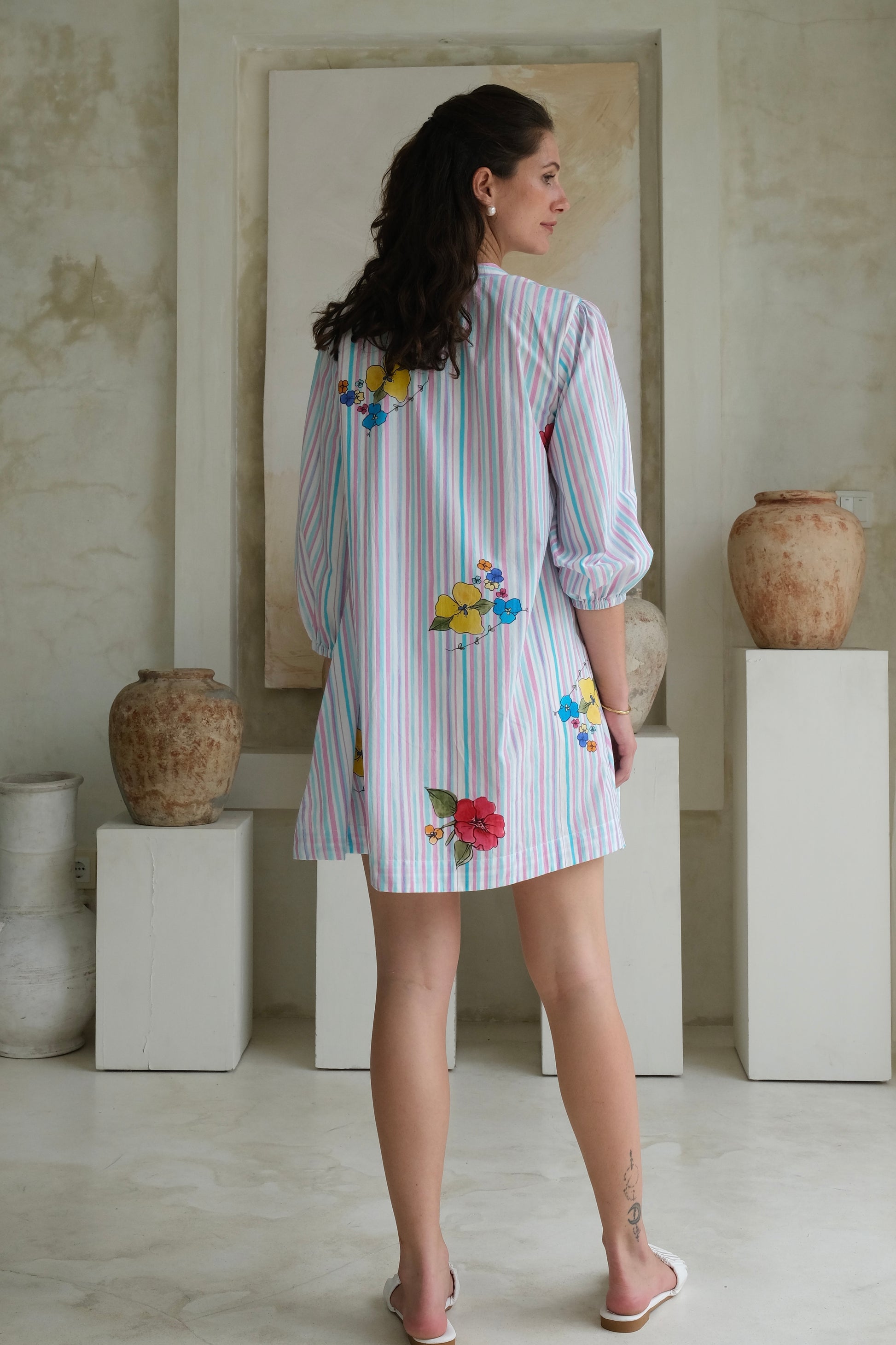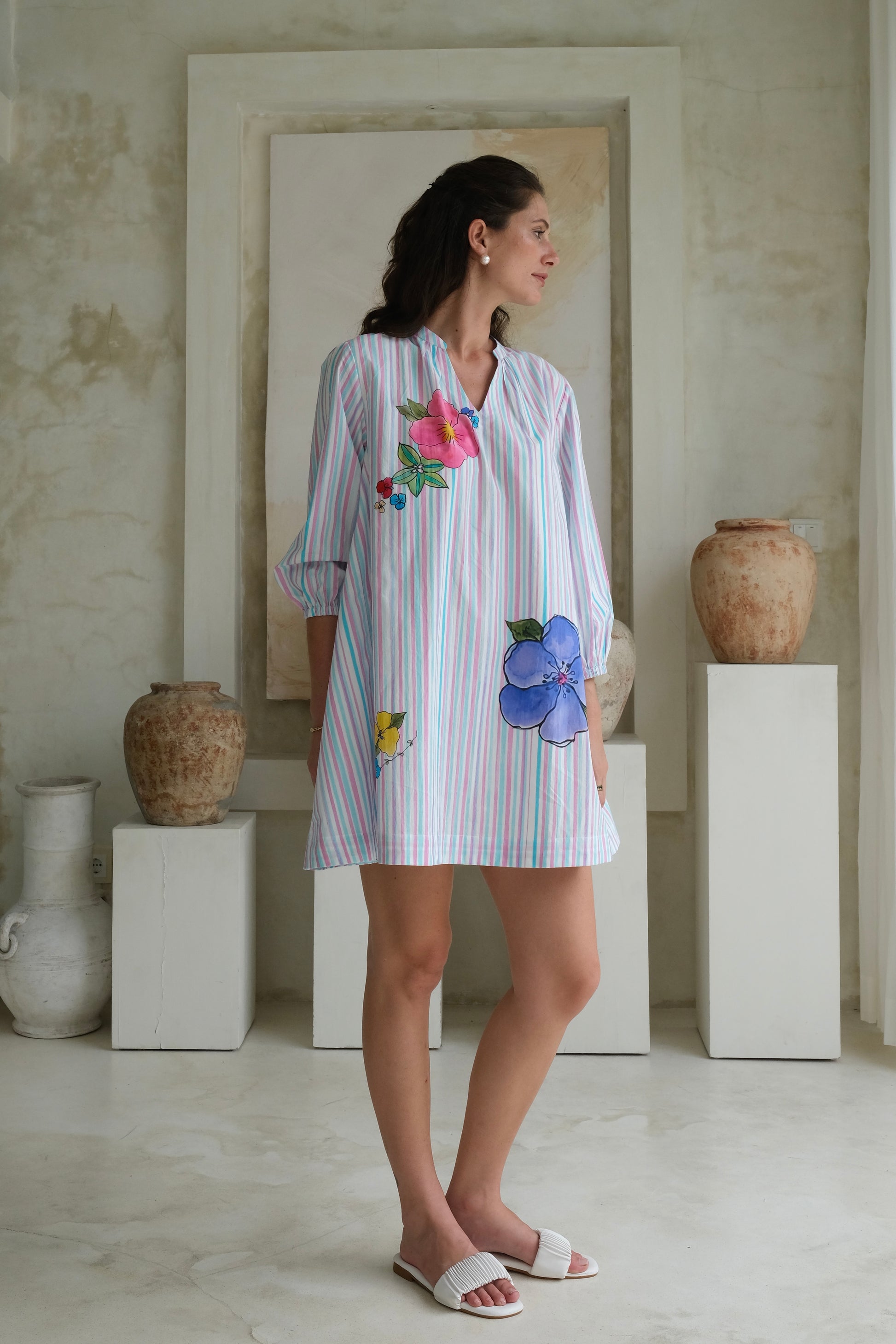 The wisteria skater dress: a whimsical short dress with a slit collar, pleated sleeves, and colorful stripes. Adorned with delicate watercolor buttercups cascading from the neck to the sweep.