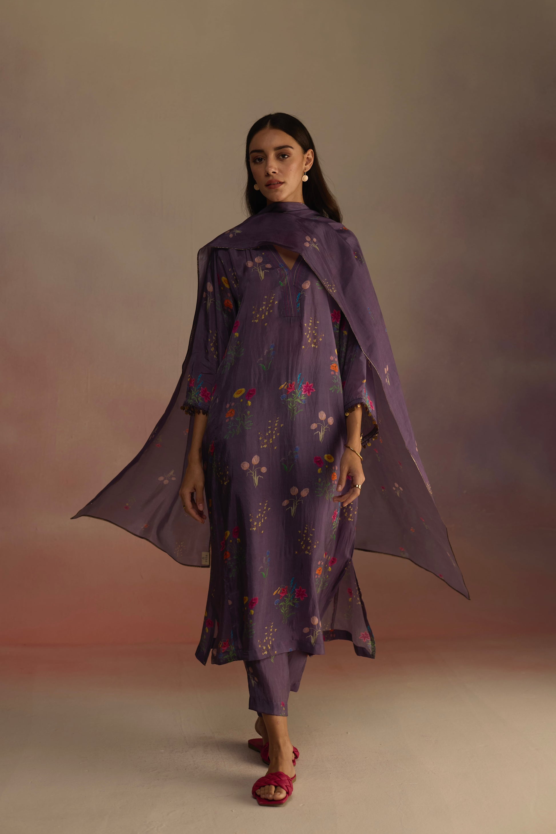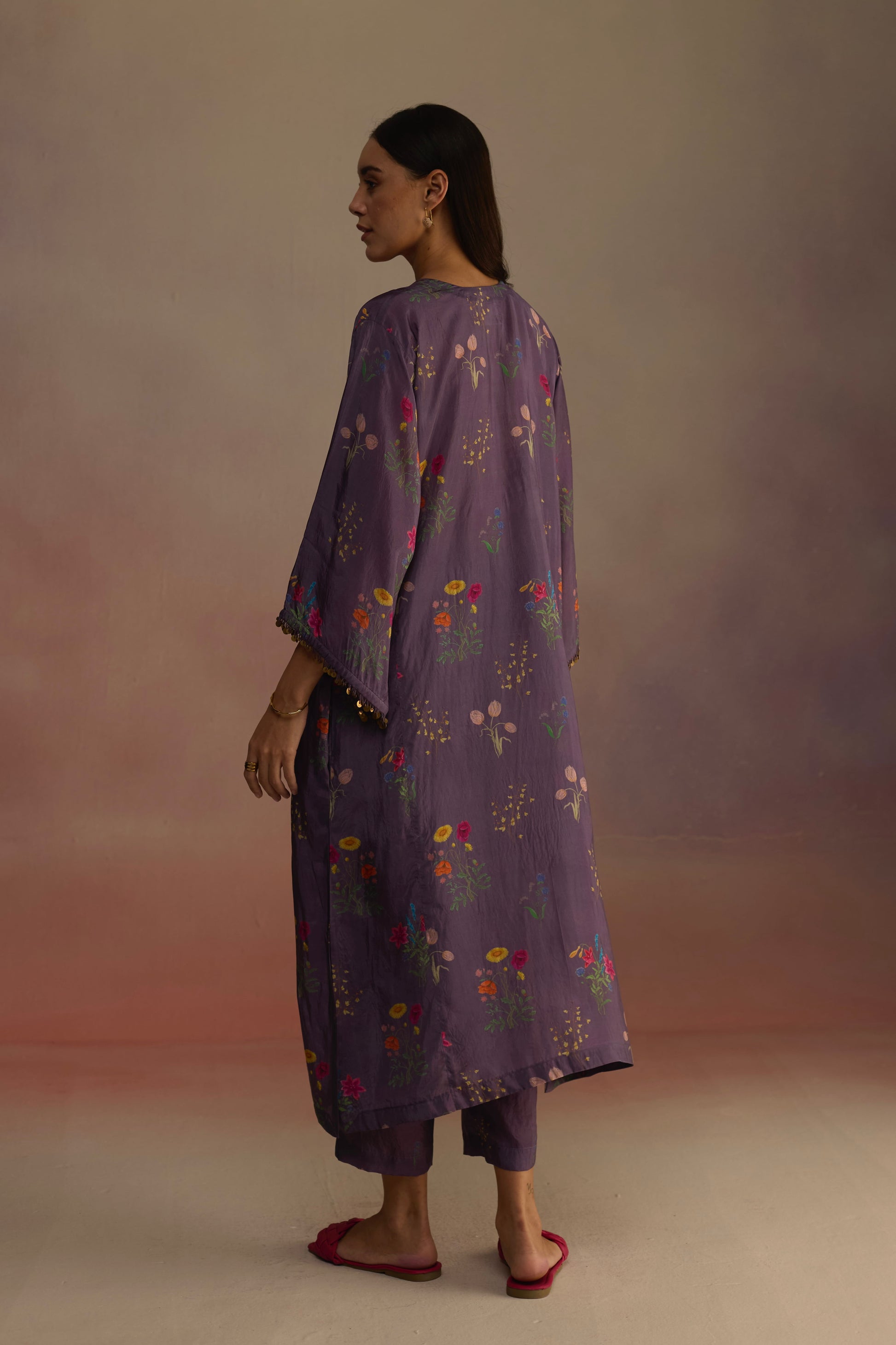 Phiran kurta set in habutai silk features watercolour florals, cascading and drooping on the sides, with delicate gold tassels on the sleeves with easy fit lowers in a similar print.