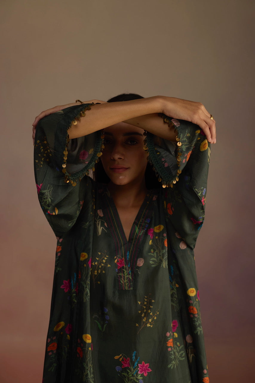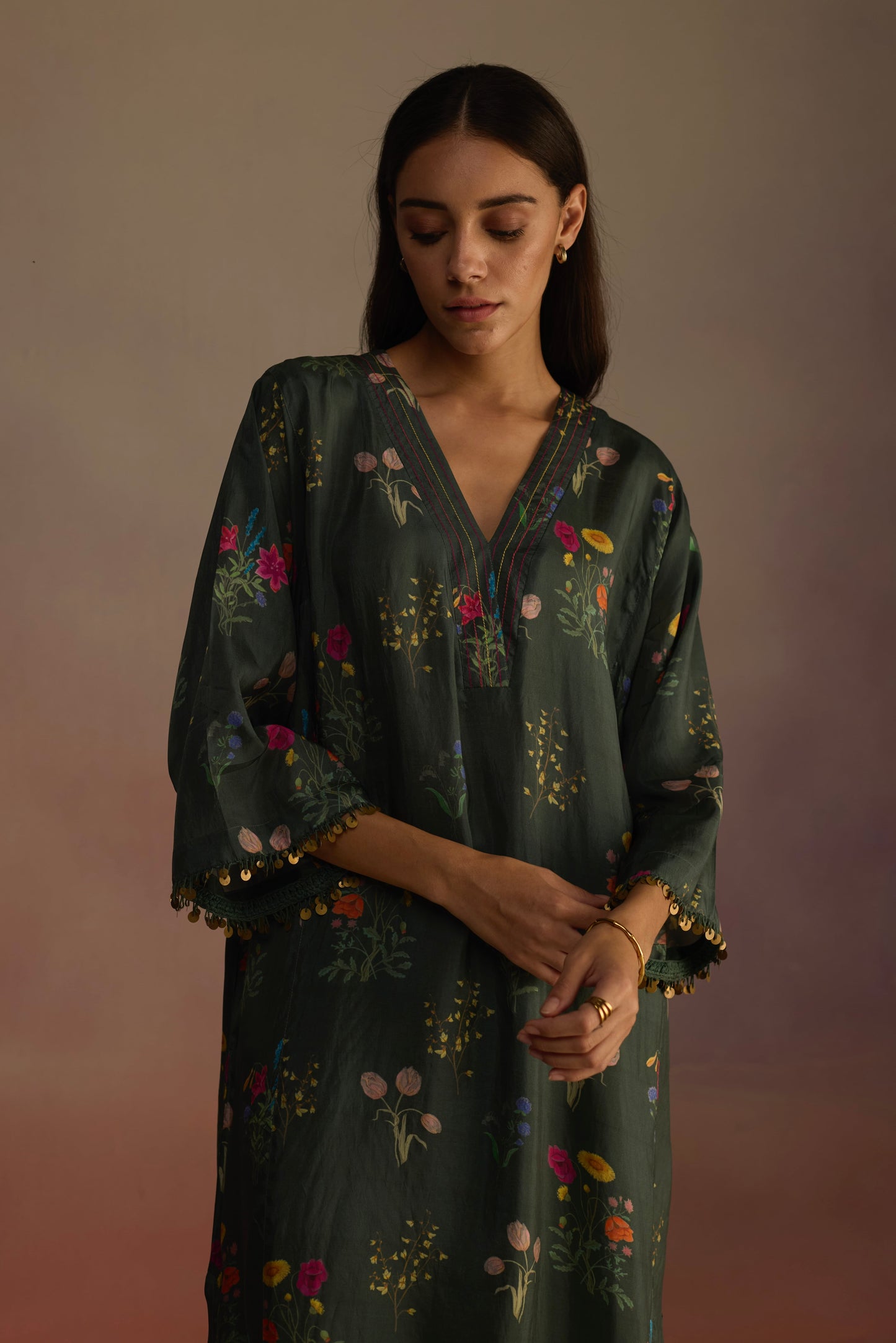 Phiran kurta set in habutai silk features watercolour florals, cascading and drooping on the sides, with delicate gold tassels on the sleeves with easy fit lowers in a similar print.