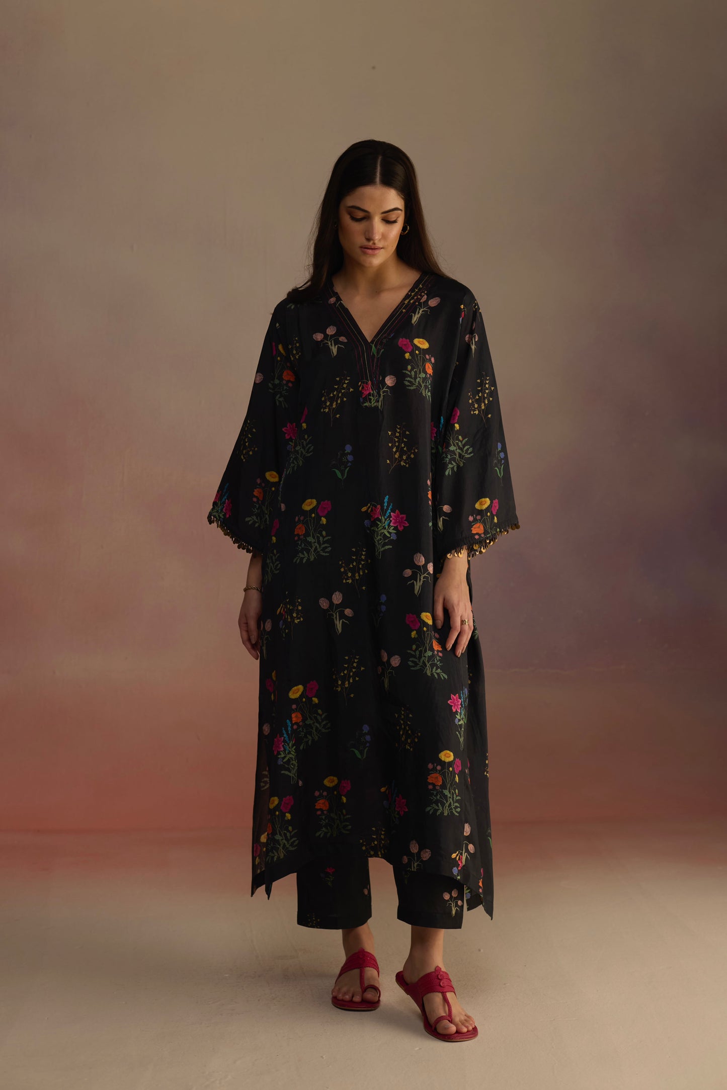 Phiran kurta set in habutai silk features watercolour florals, cascading and drooping on the sides, with delicate gold tassels on the sleeves with easy fit lowers in a similar print.
