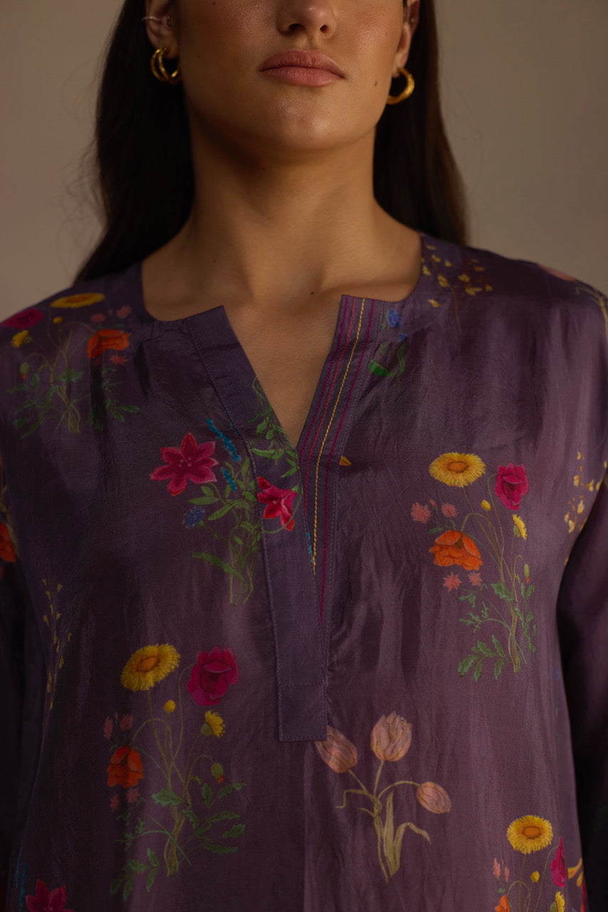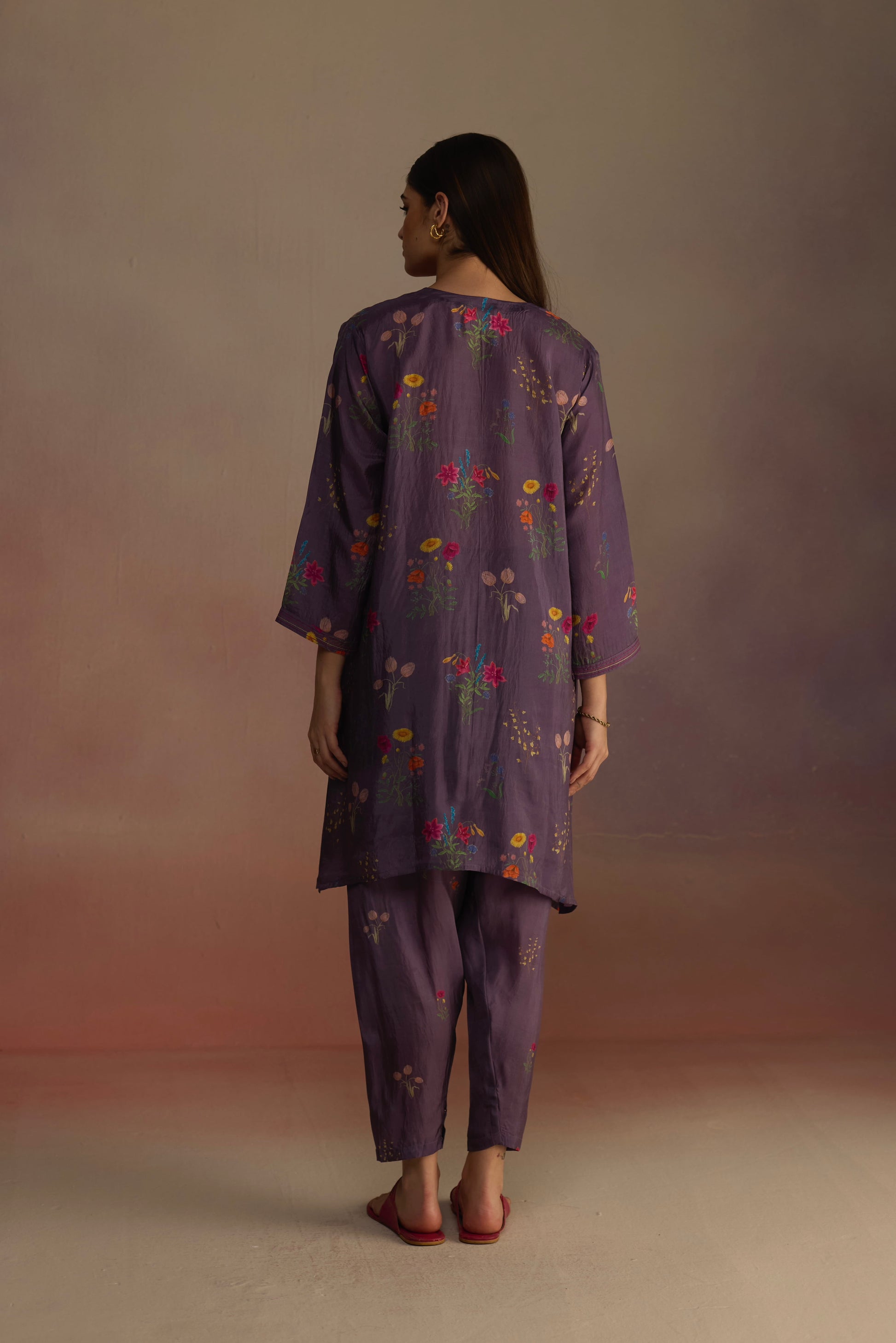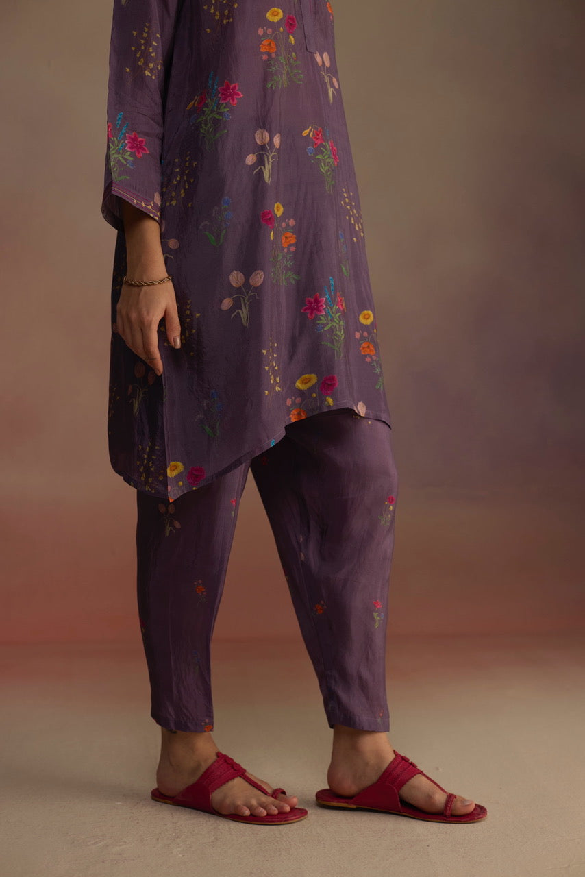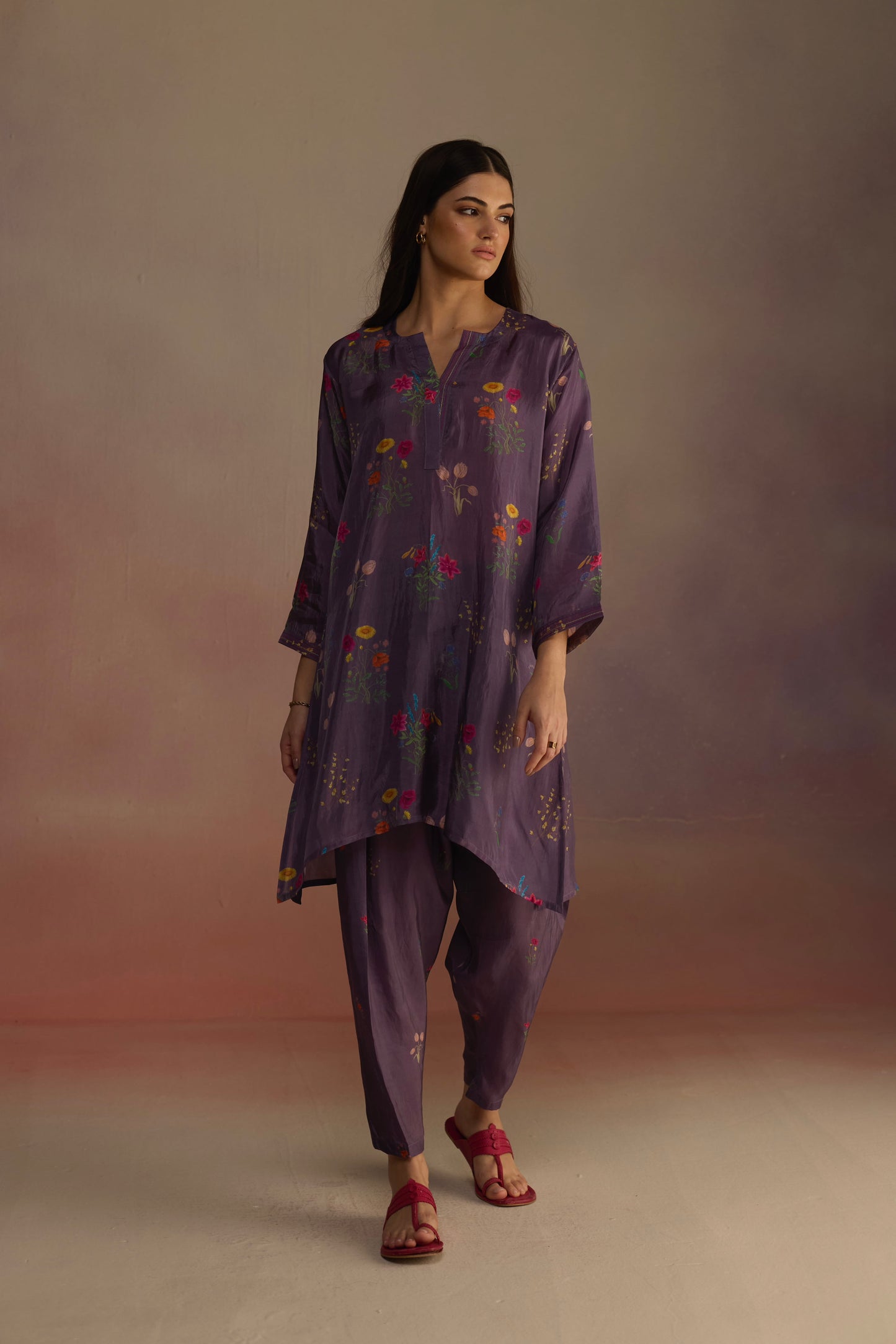 Short kurta set in habutai silk, features hand-sketched watercolor florals and subtle detailing on the neck and cuffs. Paired with tapered dhoti pants, its a perfect choice for any occasion.